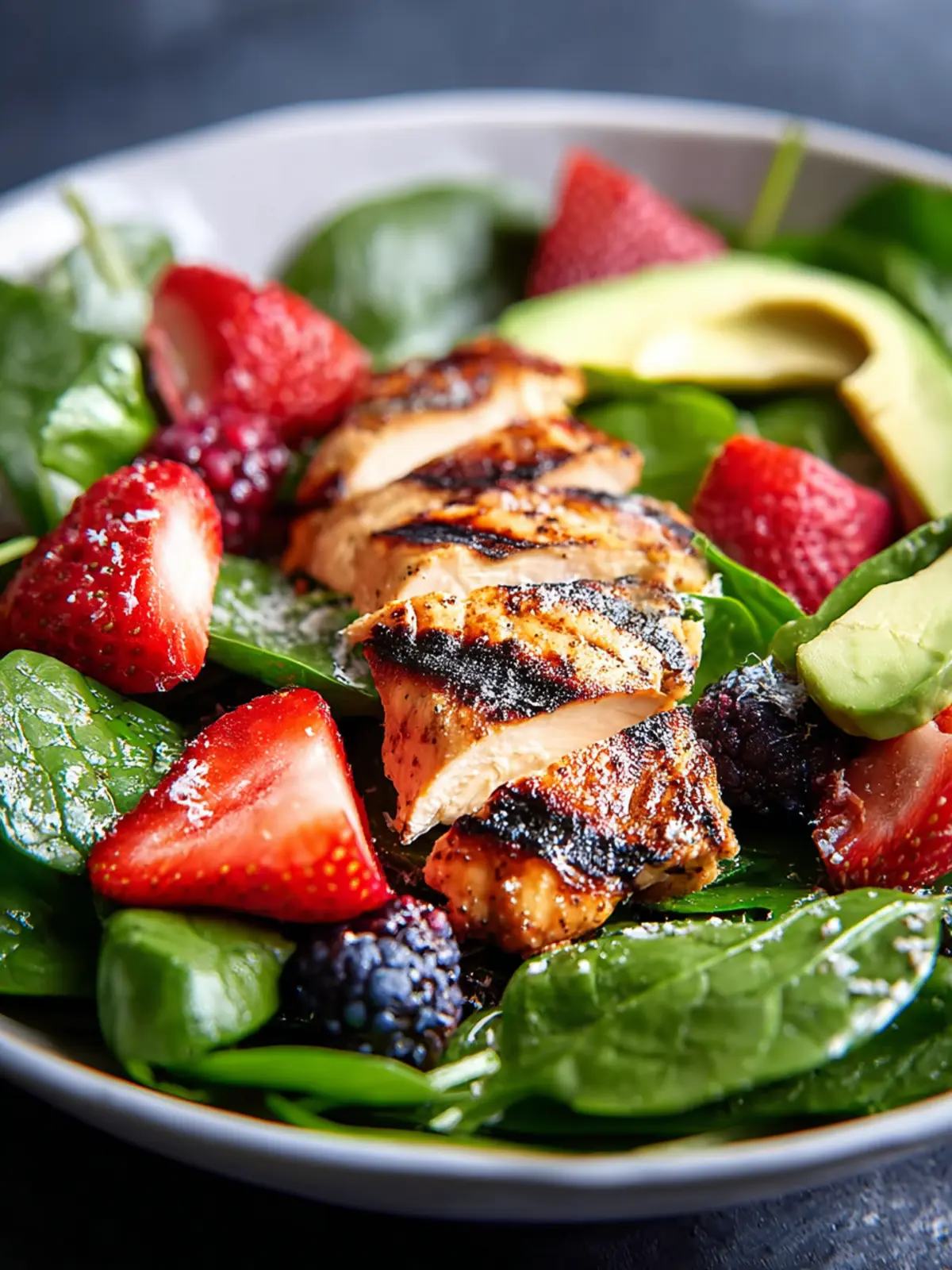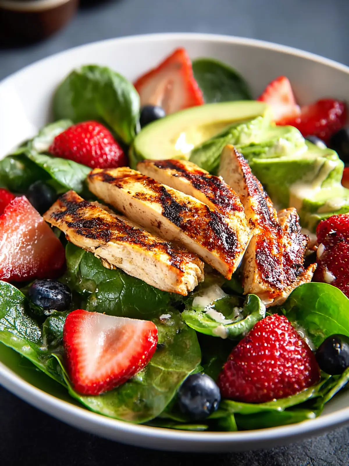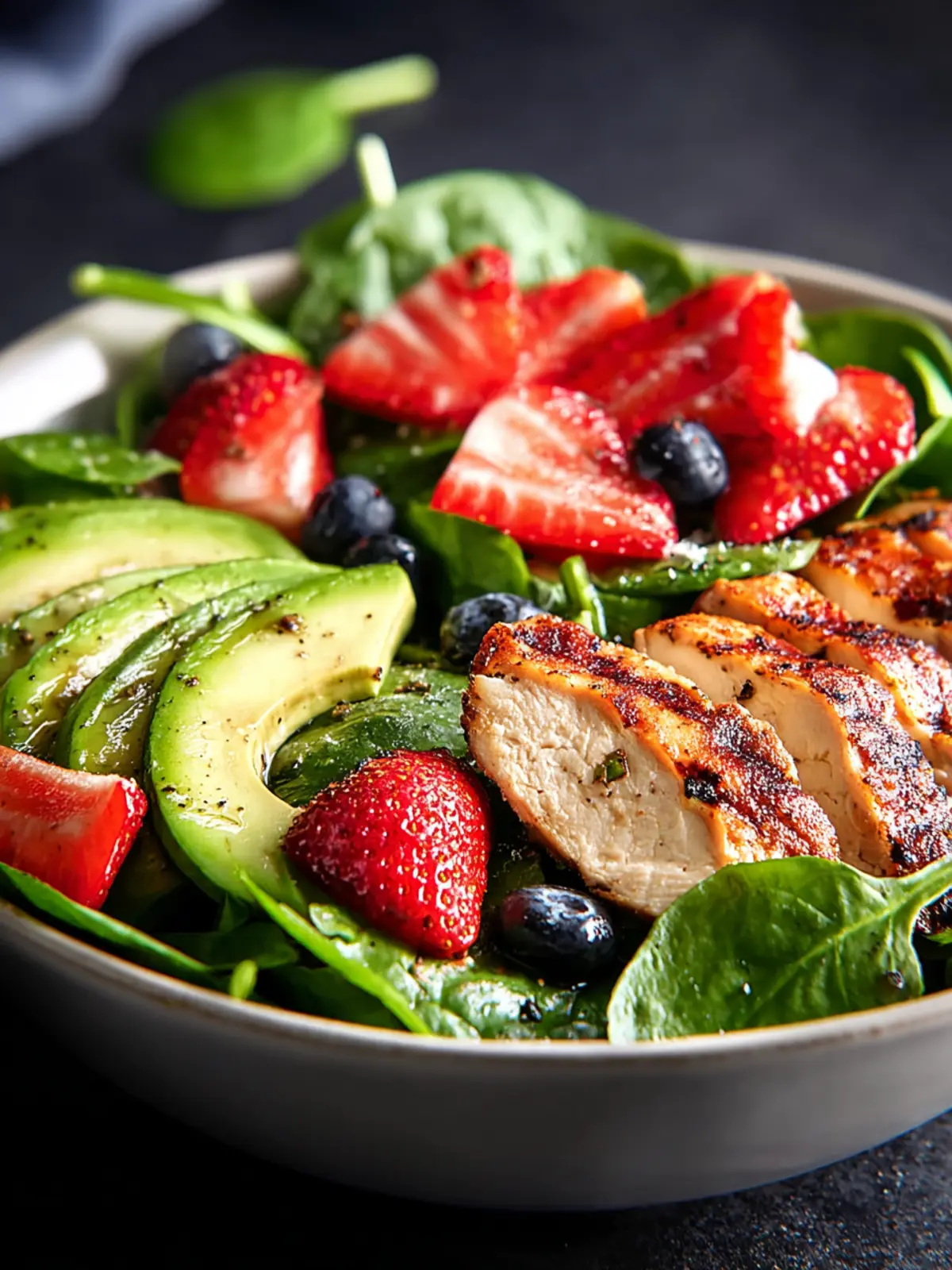 Whether you’re preparing a quick lunch for yourself or impressing friends at a gathering, this salad is a perfect choice. The combination of fresh spinach, juicy strawberries, creamy avocado, and perfectly grilled chicken provides not only a feast for the senses but also a well-balanced meal that can energize your day.