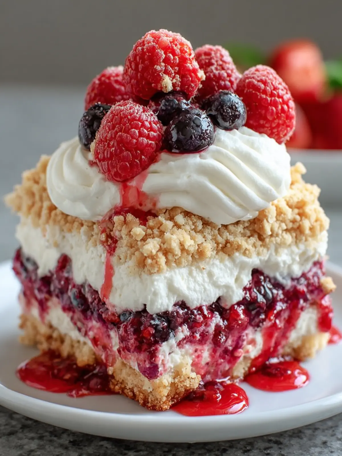 - In a chilled bowl, whip the heavy cream, powdered sugar, and vanilla extract until soft peaks form. Spread the whipped cream over the berry layer.