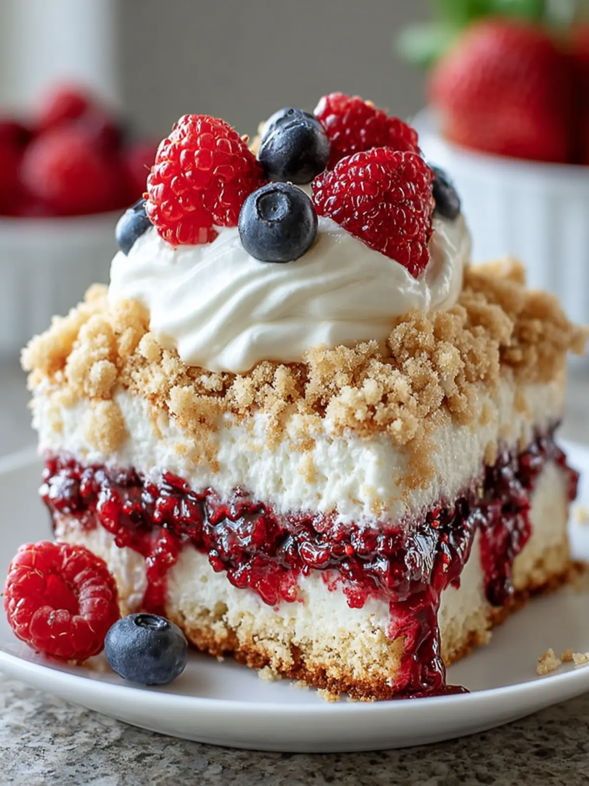 A delicious Berry Cream Crumble Cake layered with mixed berries, creamy filling, and a crumbled topping.
