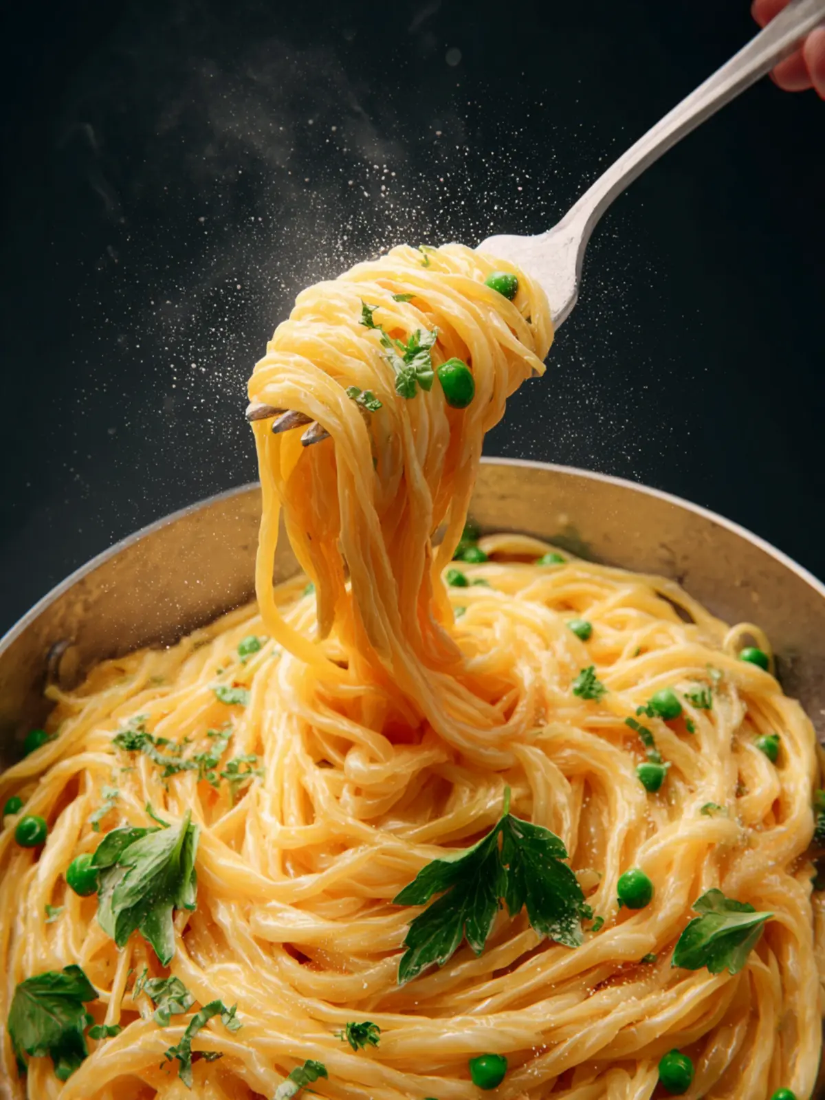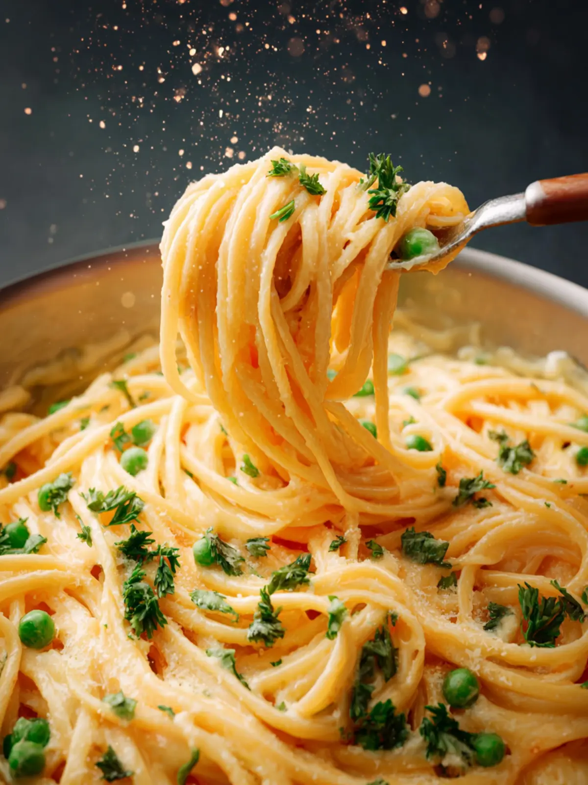 A delicious creamy spaghetti dish with peas and cheddar cheese, perfect for a quick weeknight dinner.