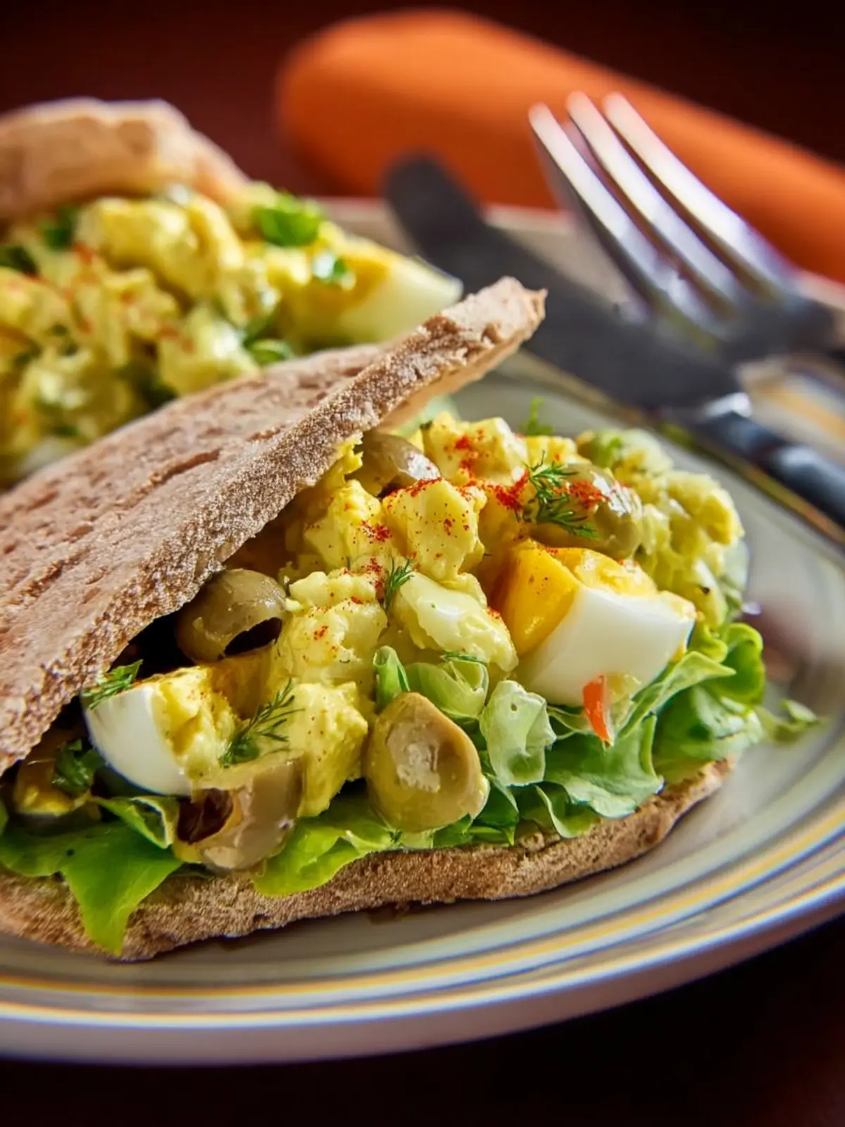 A delicious and creamy egg salad mixed with Greek yogurt, mayo, Dijon mustard, and green olives, served in pita bread.