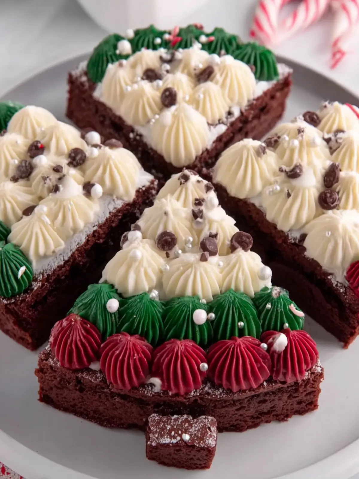 - Pipe the green and red frosting onto the brownies using a decorating bag with a star tip, creating a zigzag pattern to resemble tree branches.