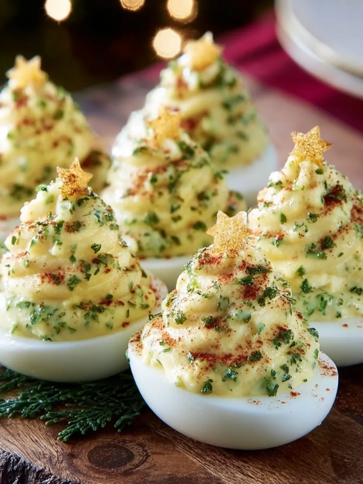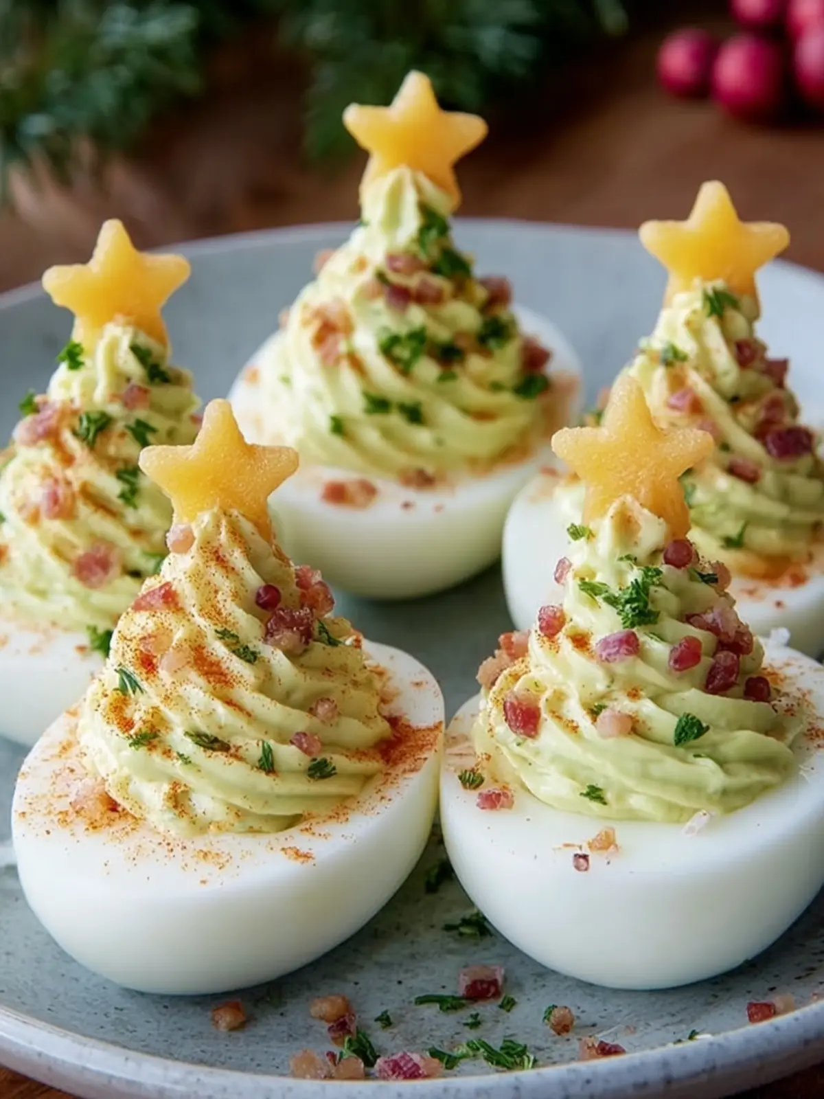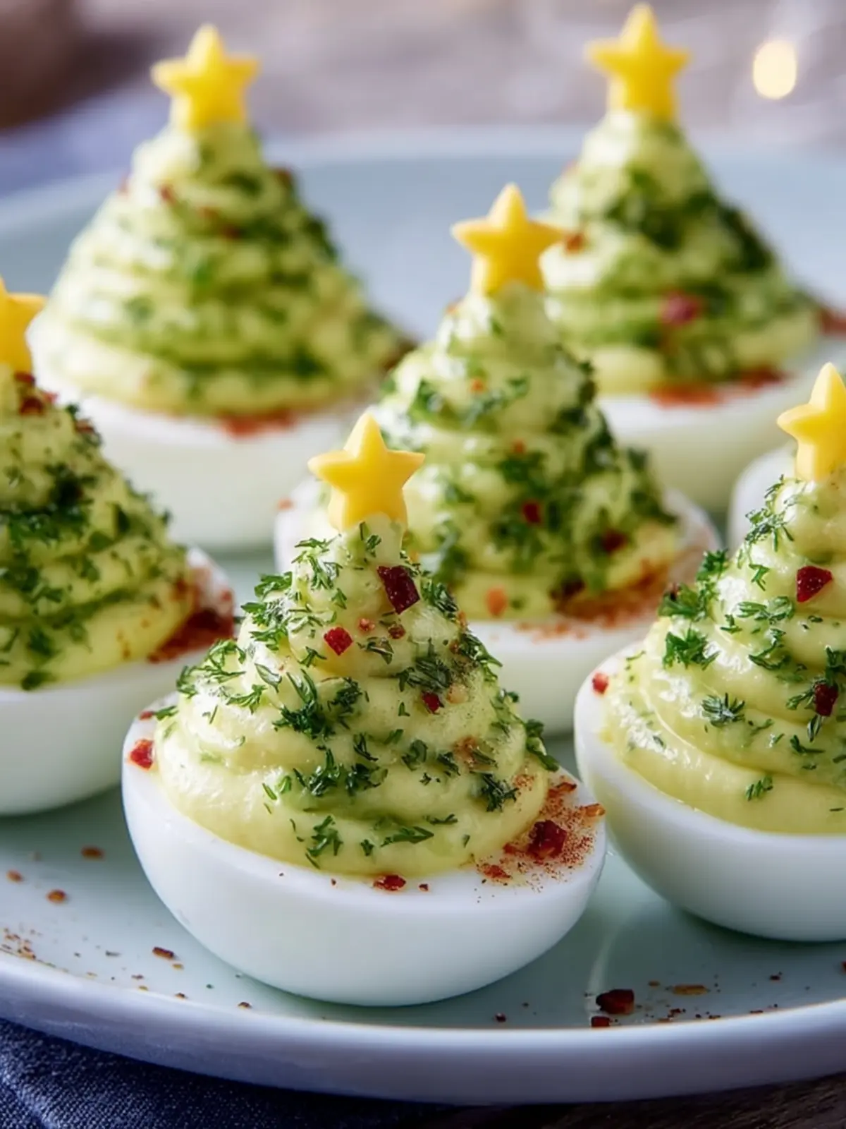 - Decorate: Sprinkle chopped parsley over the deviled eggs to mimic tree leaves and top each with a cheese star. Lightly dust with paprika for a festive touch.