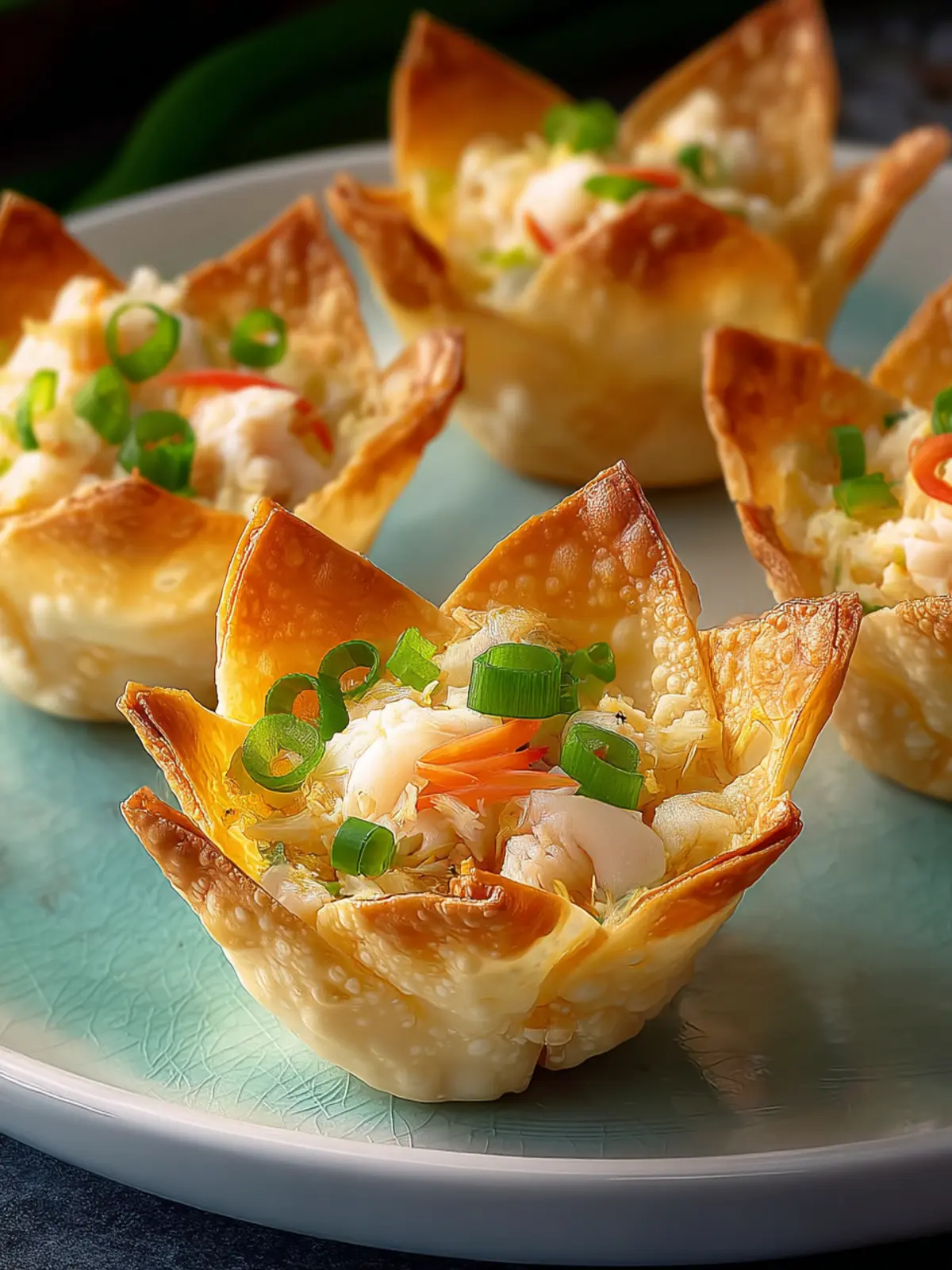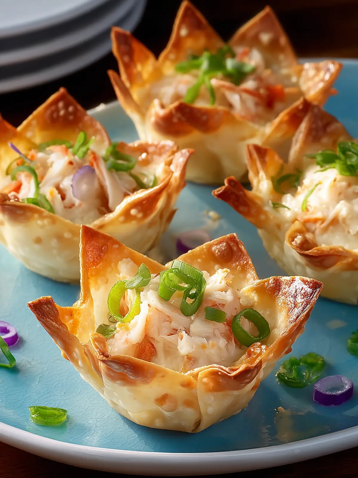 Delicious and crispy crab wonton cups filled with a creamy mixture of crab meat and cheese.