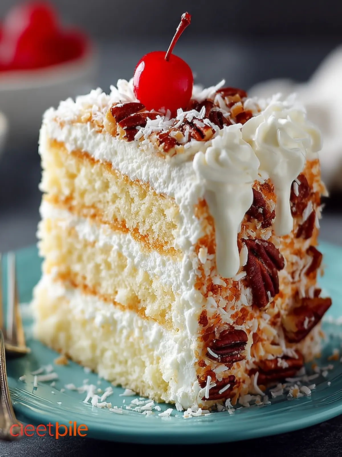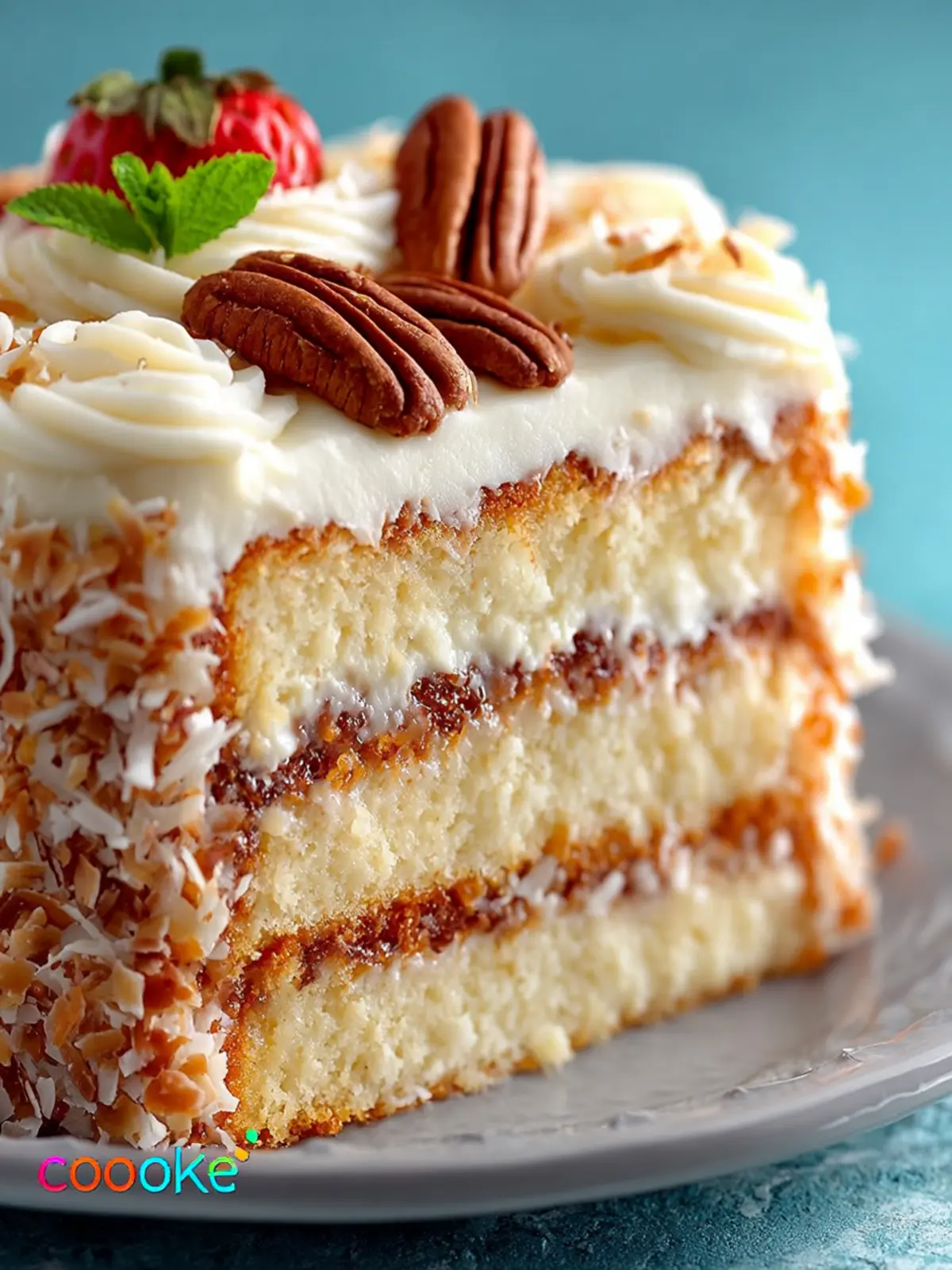 The cake itself is a delicate balance of moistness and fluff, thanks to the inclusion of coconut and nuts. These not only add depth but also a slight crunch that complements the smooth frosting, creating a symphony of textures that excite your palate.