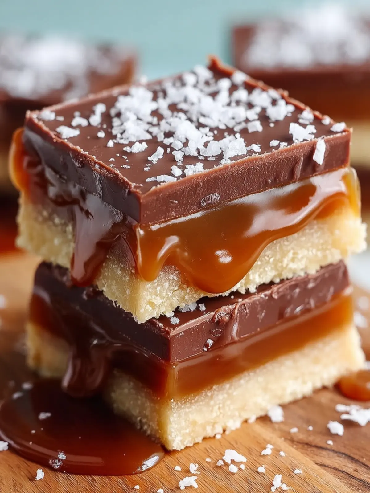 Delicious caramel shortbread bars topped with rich chocolate and a sprinkle of flaky sea salt.