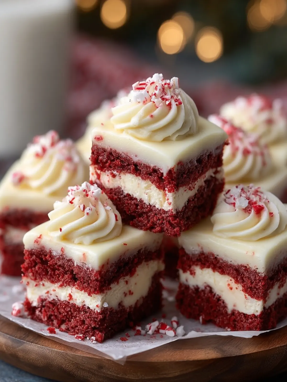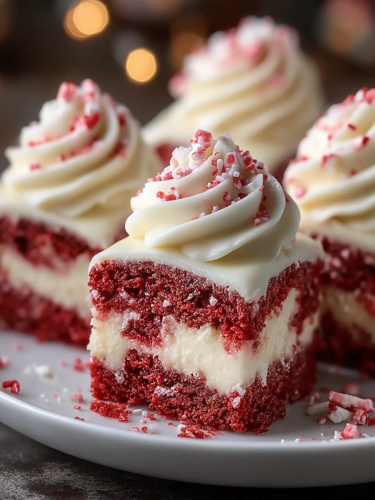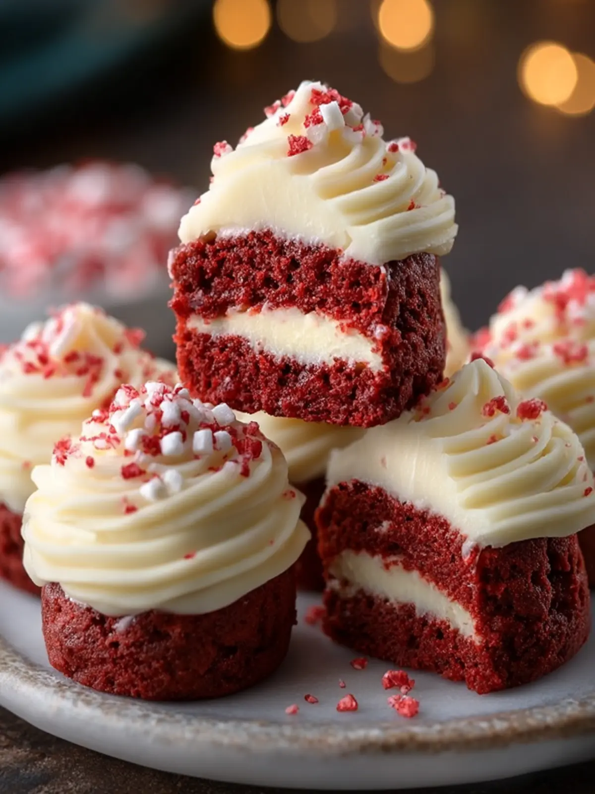 Deliciously rich red velvet mini cake bites topped with creamy frosting and festive sprinkles.