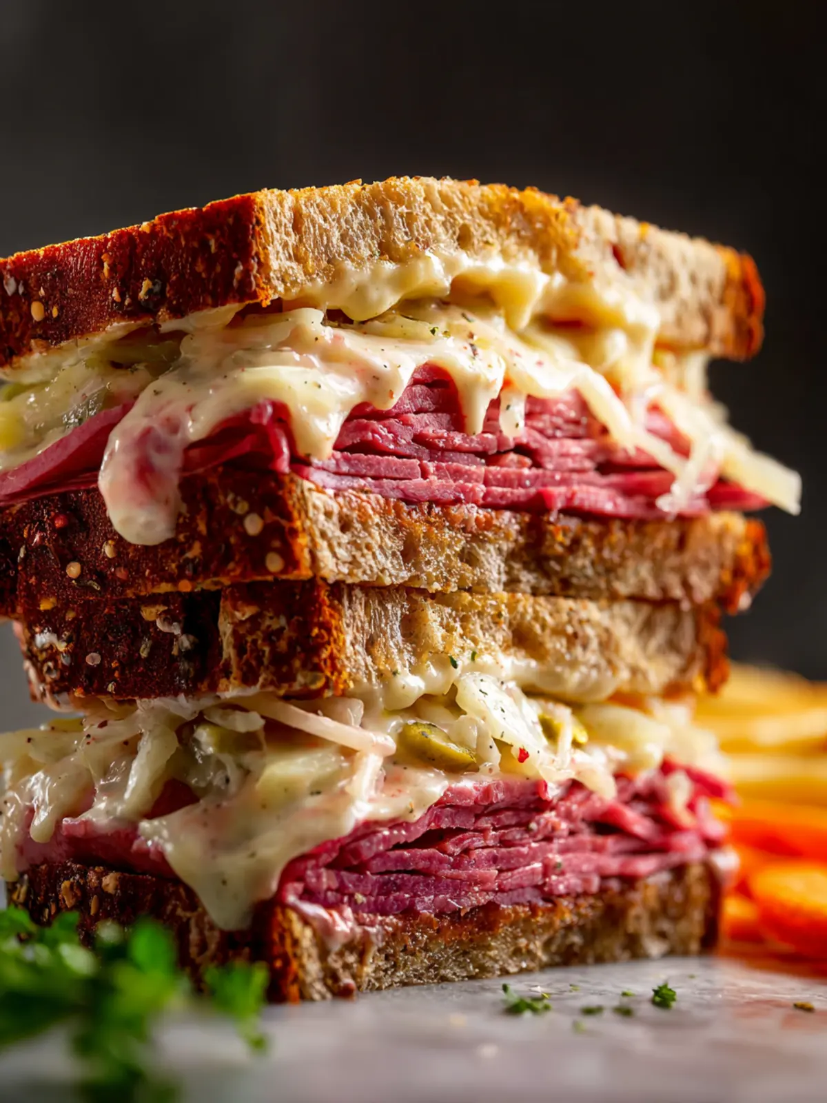 Rye Bread: I always prefer using hearty marble rye bread for my Reuben sandwich. It provides a slightly sweet, nutty flavor that perfectly balances the savory fillings. Look for fresh, thick slices to hold all the fillings without falling apart.