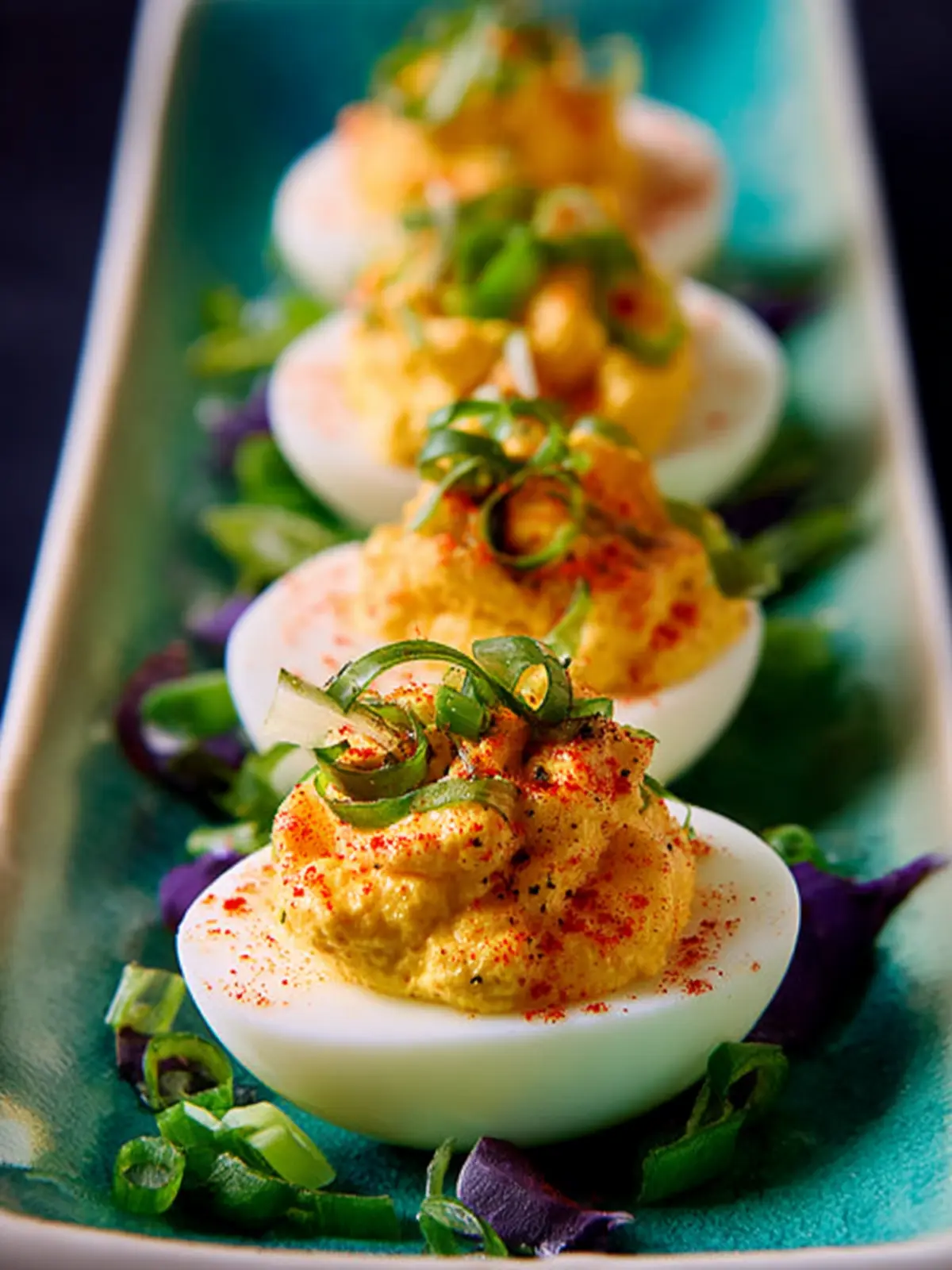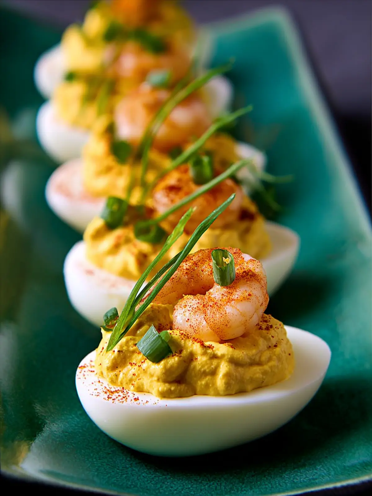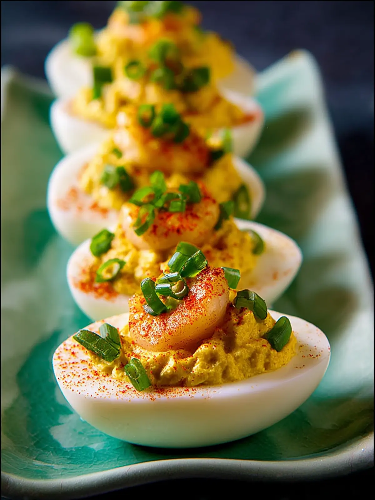 12. Garnish each egg with some of the thinly sliced green onions, and serve Shrimp Deviled Eggs right away.