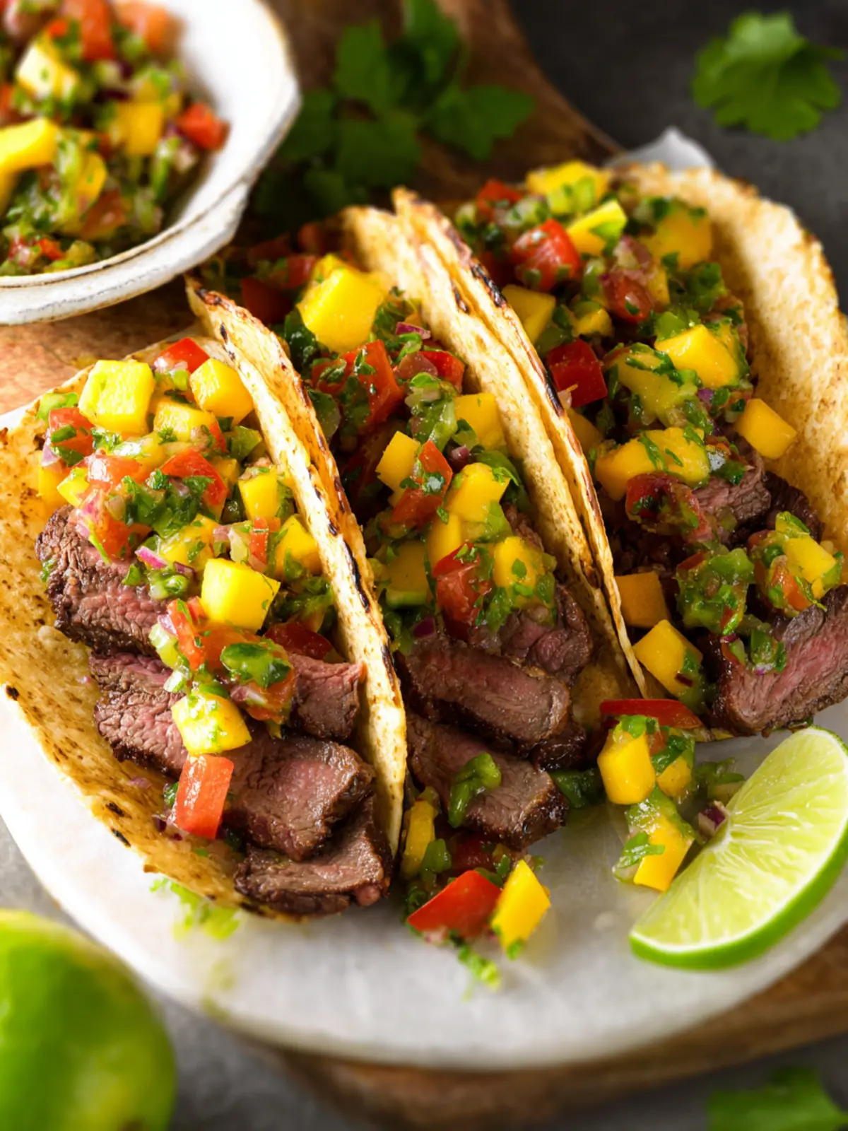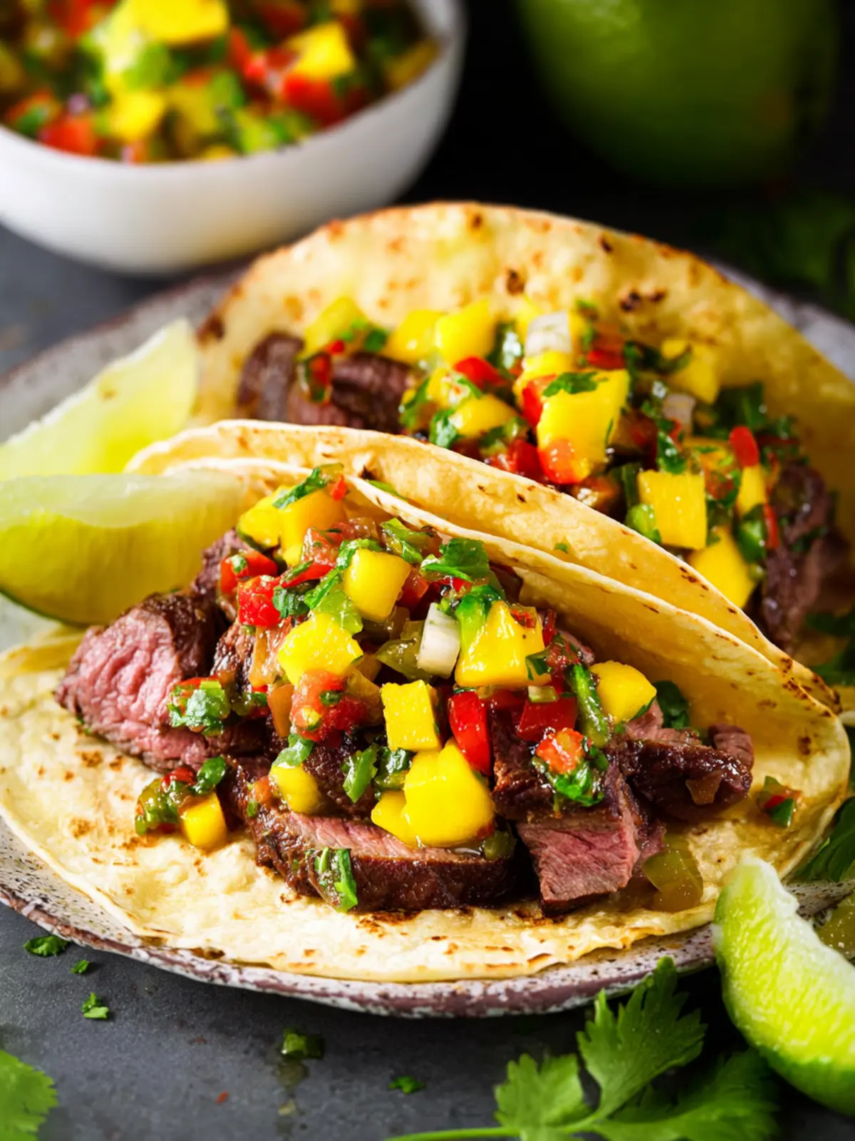 Delicious steak tacos topped with a fresh mango salsa, perfect for any occasion.