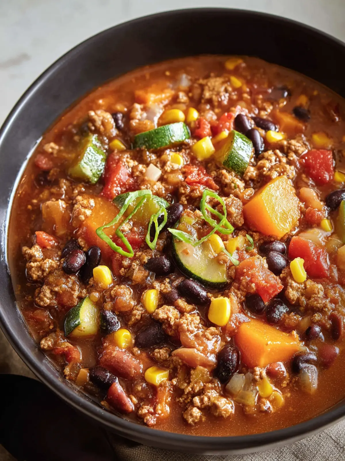 A hearty turkey vegetable chili with a variety of delicious ingredients.